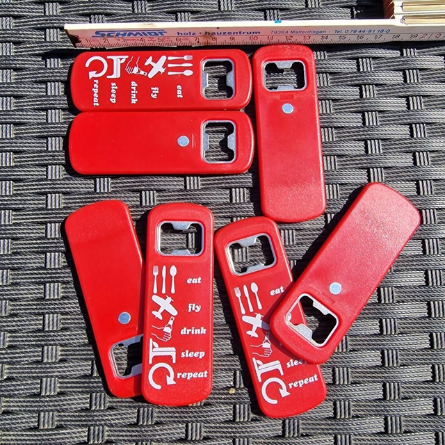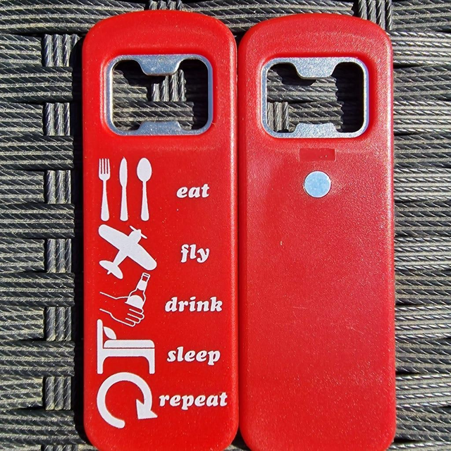 Zwei praktische Flaschenöffner (Kapselheber) in der Farbe rot. Bedruckung auf der vorderen Seite "eat, fly, drink, sleep, repeat" mit dazugehörigen Piktogrammen. Auf der unbedruckten Seite befindet sich ein Magnet, so dass Sie den Flaschenöffner an metallischen Stellen aufhängen können (z. B. an den meisten Kühlschranktüren).
