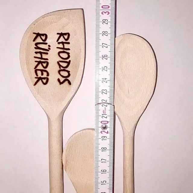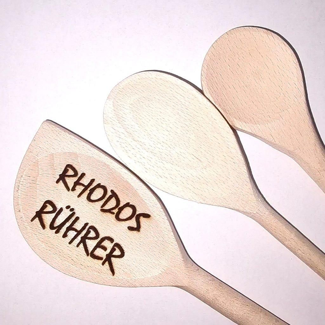 Kochlöffel aus Buchenholz. Unbehandelt. Lasergravur cirka 3cm x 2cm (Breite x Höhe) beim 20cm Löffel und 5cm x 3,5cm beim 28cm und 30cm Löffel
