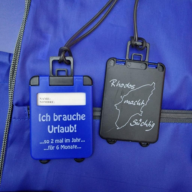 2 Kofferanhänger der Serie "Rhodos macht süchtig"